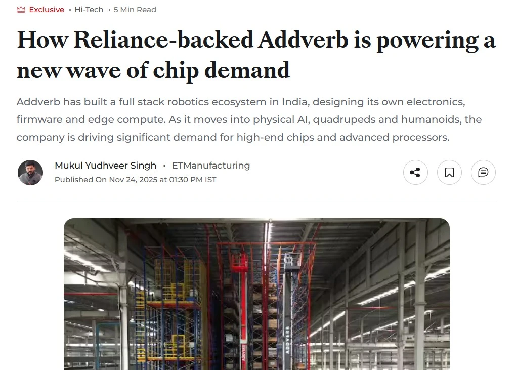 Economic Times Manufacturing featured Addverb’s journey as it expands beyond warehouse automation into advanced robotics and physical AI. In the interview, Sangeet Kumar, Co-founder & CEO of Addverb, shared how the company’s deep vertical integration across hardware, electronics, software and AI is driving demand for advanced semiconductors. He highlighted Addverb’s growing portfolio of next-generation robots, including quadrupeds and humanoids, and its focus on building intelligent, compute-intensive systems that support India’s evolving semiconductor and manufacturing ecosystem.